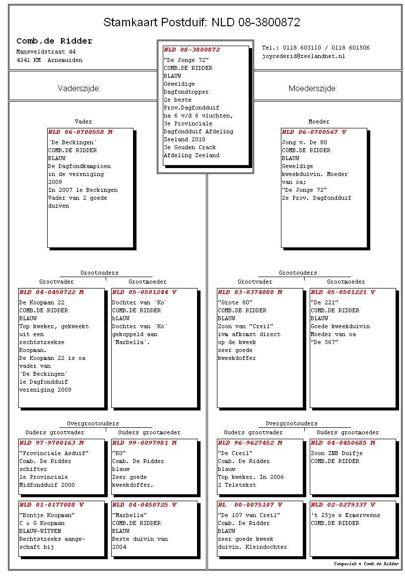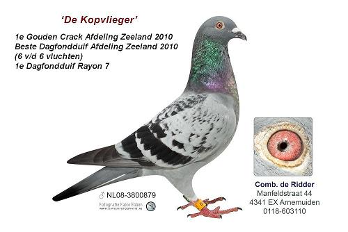 De absolute crack van 2010. "De Kopvlieger" is een zoon van "ZNB Duifje" zonder twijfel onze beste kweekduivin van het hok. Zij is al met verschillende doffers moeder van 3 teletekst duiven. "ZNB Duifje" was gekoppeld met de "Provinciale Vitesse Kampioen van 2006". In de stamboom van deze doffer kom je weer meerdere malen de stamvader van het hok ''t 25je" tegen.