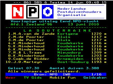 13/06 NPO La Souterraine: Zon en een matige N wind, duivenweer. Echt een vlucht voor goede duiven in vorm. Blijkbaar zat het met de vorm goed want ze kwamen weer voortreffelijk naar huis met als hoogtepunt een Teletekst vermelding. Alle 9 oude duiven meegegeven, de overige 16 duiven (jaarlingen) thuisgehouden voor de midfondvlucht van volgend weekend. Provinciaal werd begonnen met de 9e, 11e en 43e prijs. Een pracht prestatie met 9 duiven mee en alle 9 prijs. De 9e provinciaal werd gewonnen door "De Kopvlieger", 08-79 een zoon van het super duivinnetje "ZNB Duifje", reeds moeder van 3 Teletekst duiven. Net geen teletekst voor de absolute crack van het hok "De Primavera", maar met een 11e provinciaal was het weer raak voor deze topper