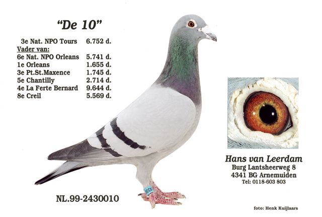 Hans kreeg in ’99 van Joost en Jacco de NL99-2430010 “De 10” De doffer werd gekweekt uit een Kleinzoon van “’t 25je” x Dochter van ‘’t 25je Deze doffer ontpopte zich tot een geweldige vlieg- en kweekduif” Zo vloog “De 10” oa 3e NPO Tours tegen 6752 duiven. Ook als kweker bleek hij goud waard en is nu vader van oa: 6e Nat. Orleans 5741 duiven 1e Orleans 1655 duiven 3e Pont St Maxence 1745 duiven 5e Chantilly 2714 duiven 4e La Ferte 9644 duiven 8e Creil 5569 duiven