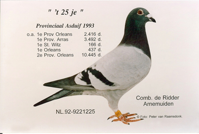 Andere zoon van “’t 25je” is de NL95-9505842, zeer goede kweekdoffer en vader van een van de beste dagfondduiven van de laatste jaren 03-026 oa 7e NPO Argenton, 11e NPO Tours enz 3e Dagfondduif Afd. Zeeland 2006